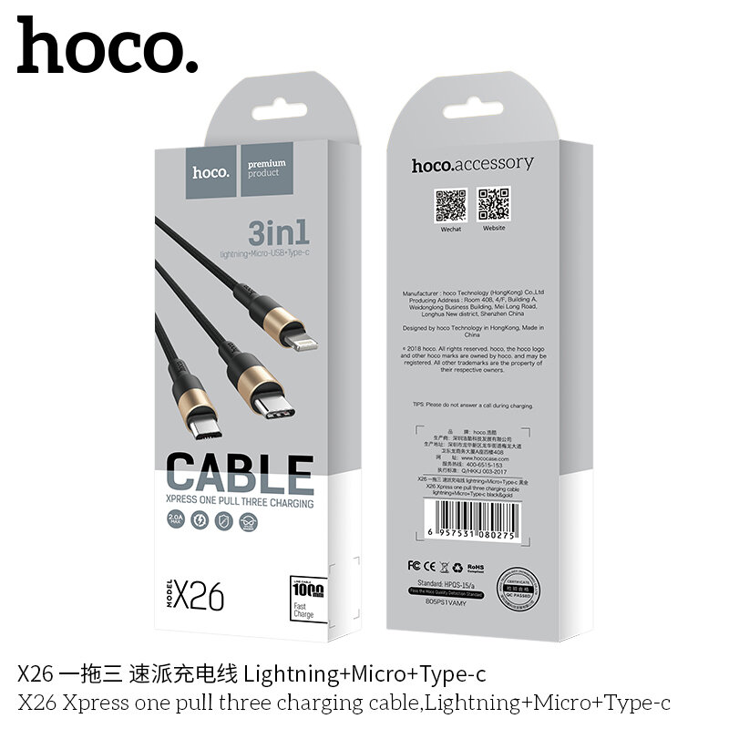 Кабель HOCO X26 Xpress 3 в 1, USB - Lightning, Micro USB, Type-C, 2.0A, длина 1.0м, черный с золотым