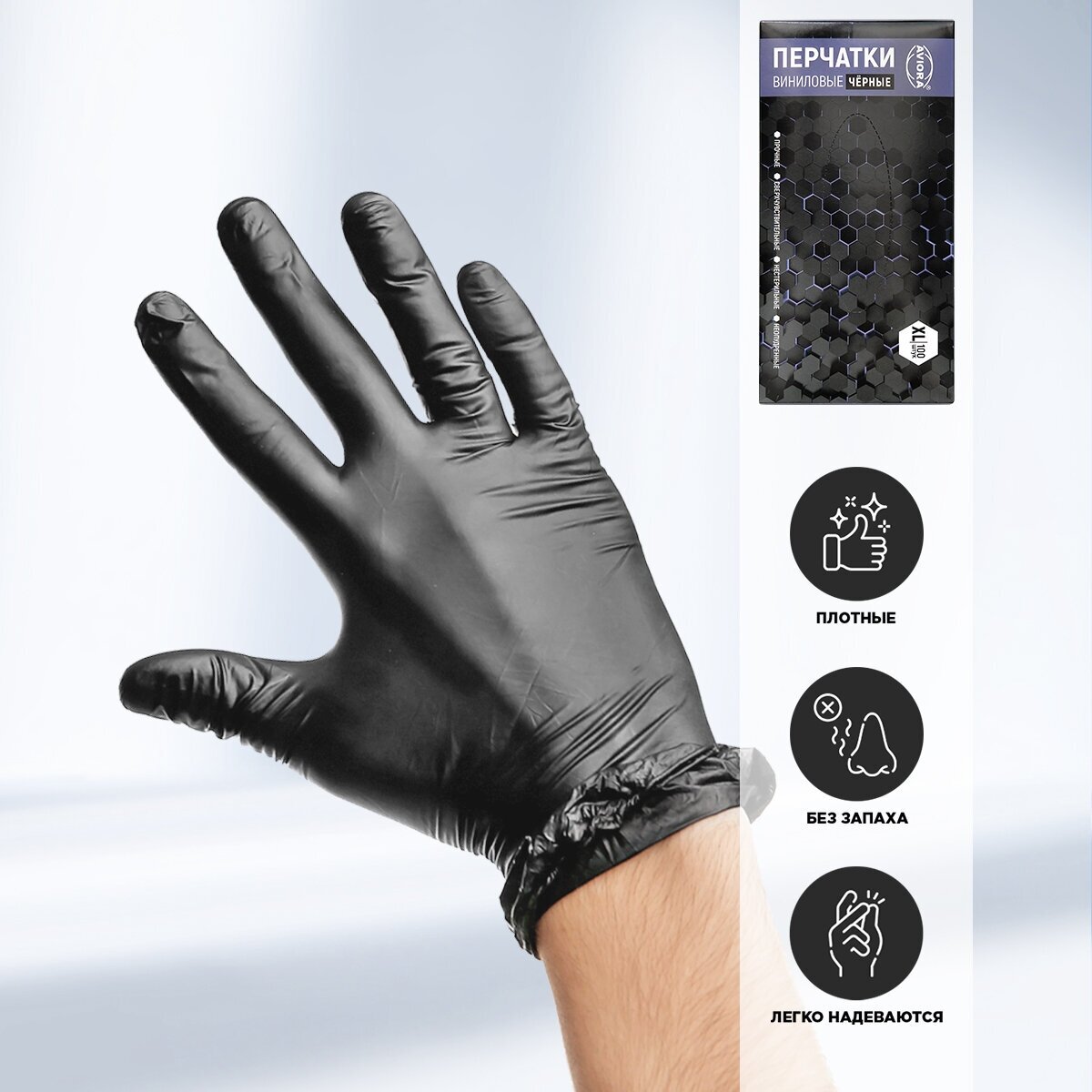 Aviora Перчатки виниловые, черные, неопудренные, одноразовые, размер L, 100 шт. в упаковке