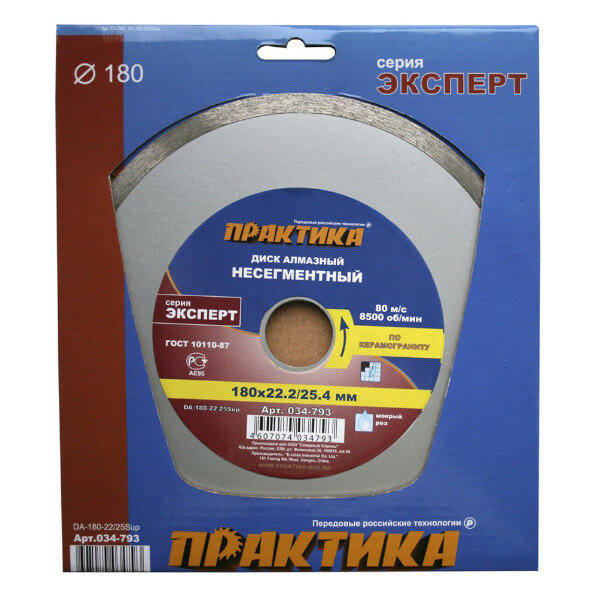 Диск алмазный несегментный "Эксперт-керамогранит" 180 х 22/25,4 мм, (1 шт.) коробк ПРАКТИКА 034-793
