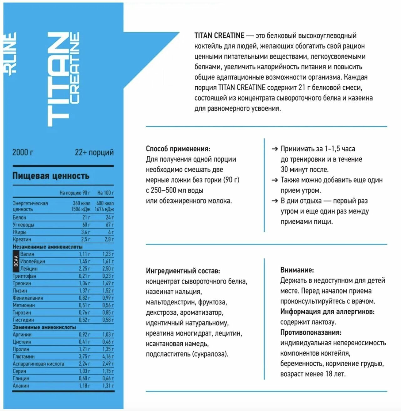 Гейнер Rline Titan Creatine, ваниль, 4000 гр