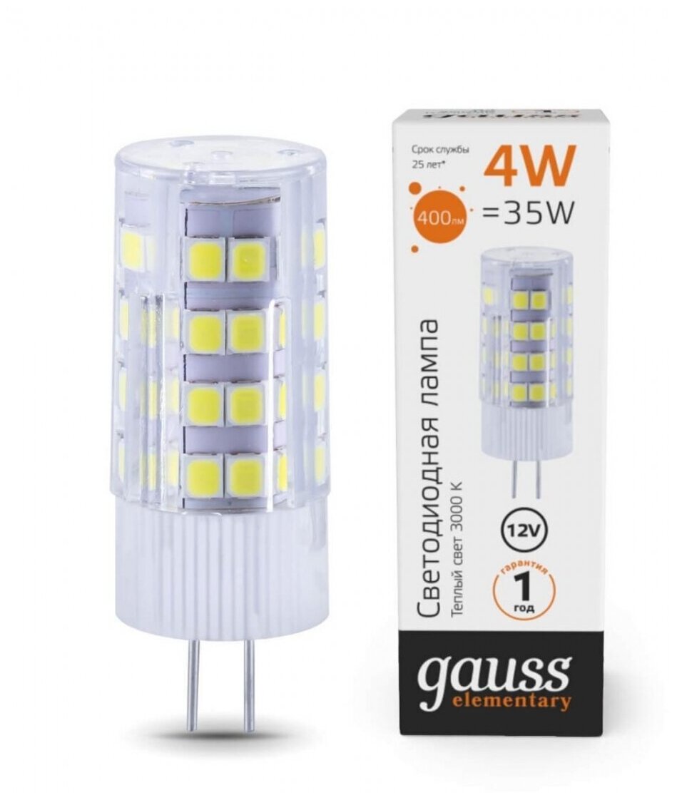 Лампа светодиодная G4 4Вт 3000K теплая 12В керамика 400lm (1/10/200) Gauss Elementary