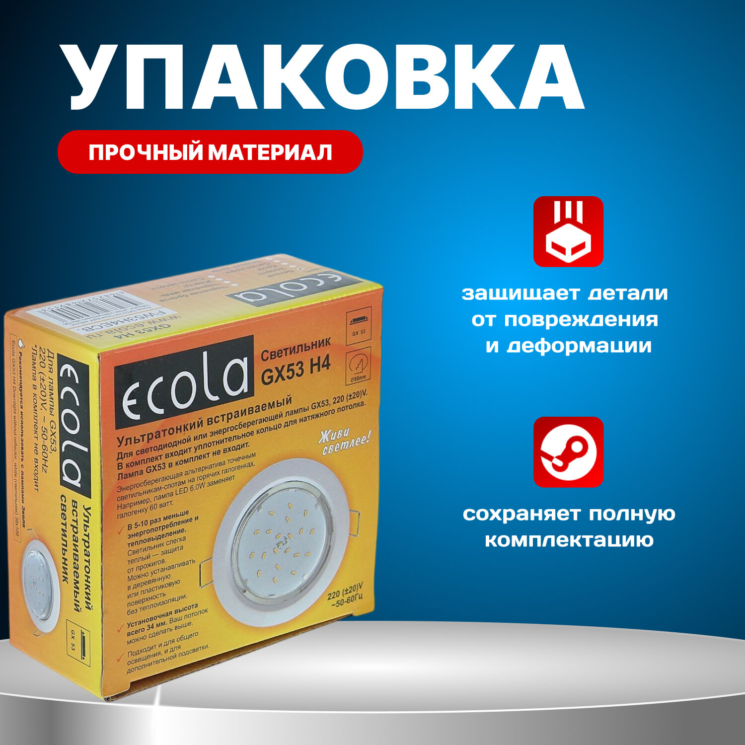 Светильник встраиваемый Ecola GX53 для ламп с цоколем GX53 макс. 20 Вт, цвет хром, размер 106x38, врезное отверстие 90 мм, термокольцо в комплекте, FC53H4ECB