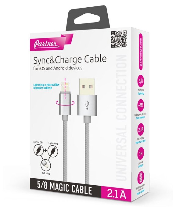 Кабель USB 2.0 - MAGIC 5/8 (microUSB+Lightning), 1м, 2.1А, Partner интересное: