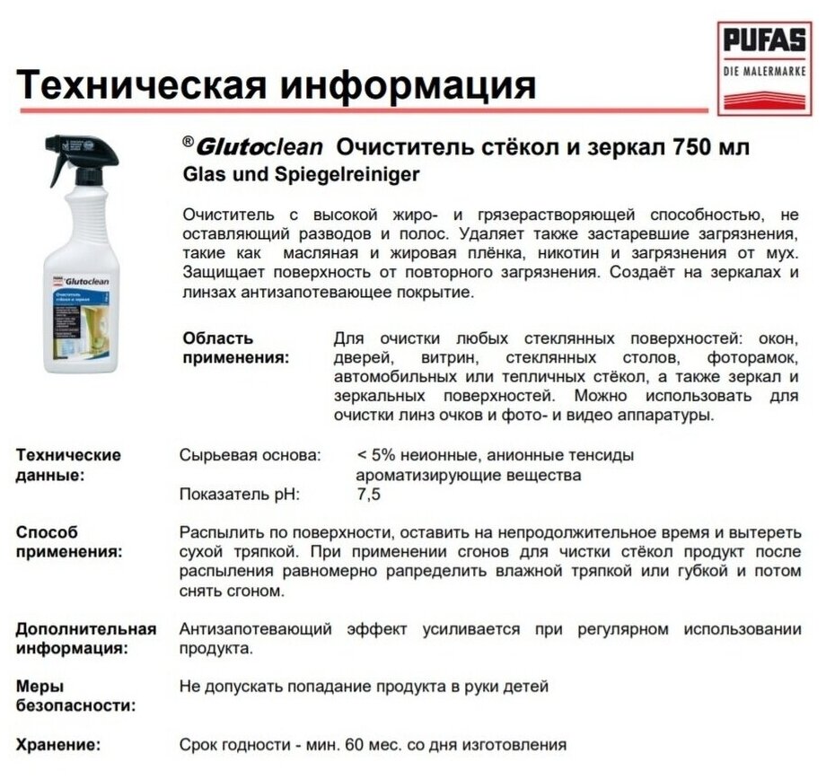 PUFAS Glutoclean Спрей очиститель стекол и зеркал, 750 мл