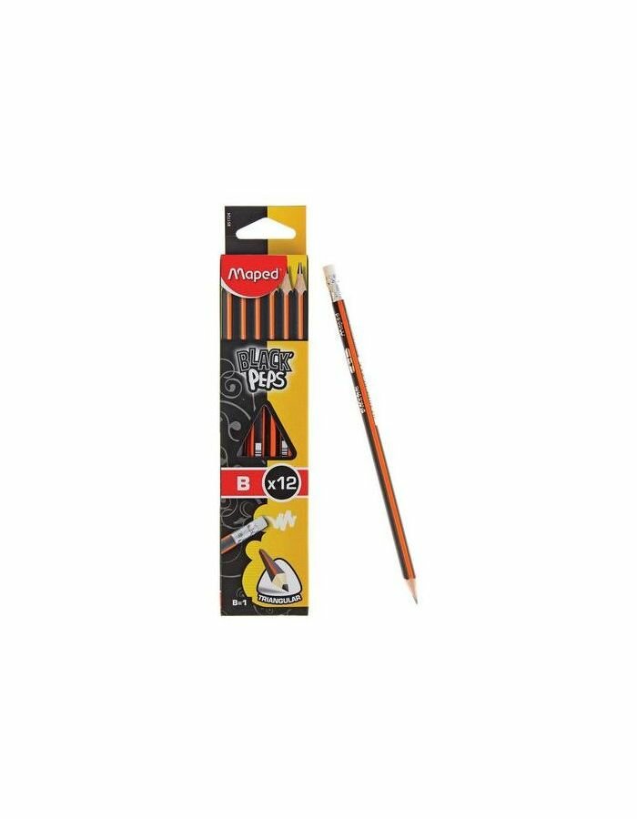 Карандаши чернографитные MAPED В наборе из 12 штук, Black Pep's, B, трехгран., с резинкой