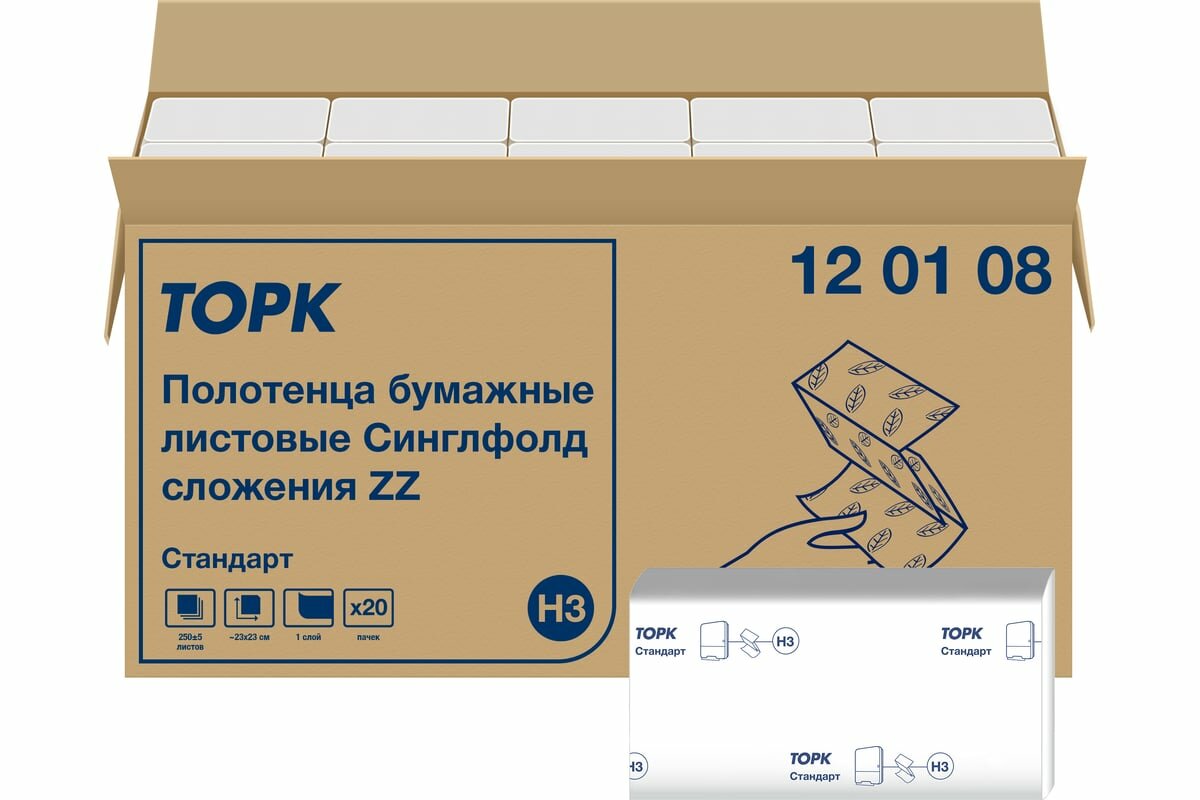 Промо H3 Tork Universal листовые полотенца сложение ZZ, Система H3 - Полотенца сложения ZZ и С, 23см х 23см., 1 слойные, белые с тиснением , 5000 листов, 20 штук в коробке (120108)