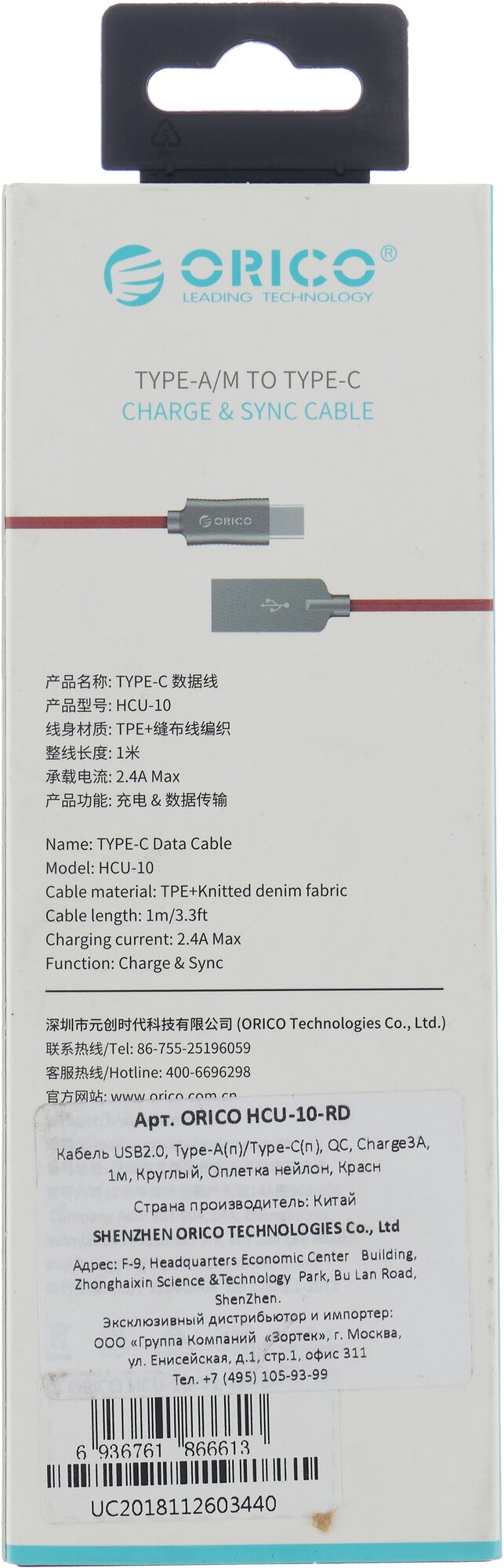 Кабель ORICO HCU-10 (красный) (USB2.0/Charge3A Type A(m)/Type C(m), круглый, оплетка нейлон) 1,0 м