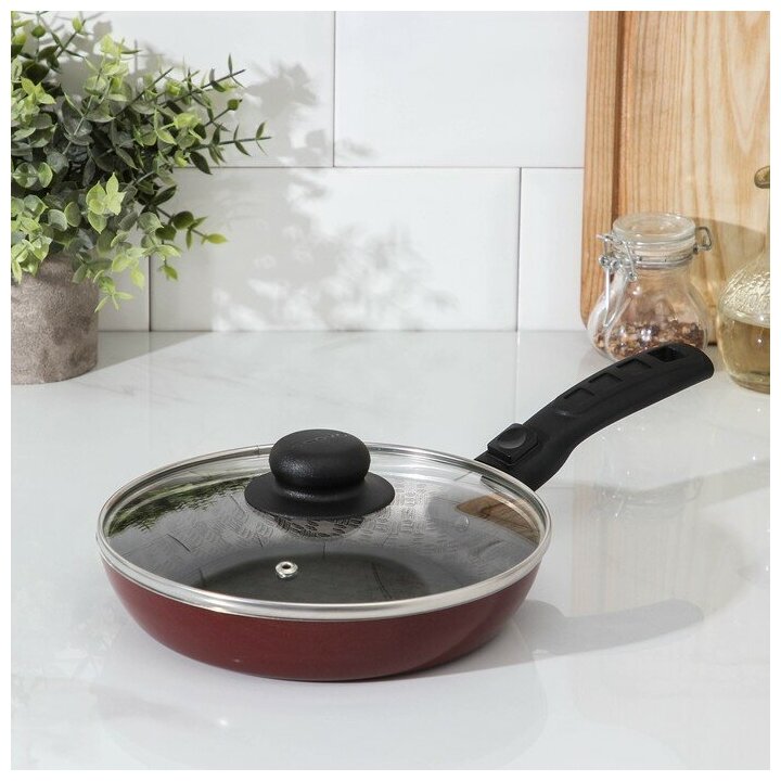 Сковорода «Альфа», d=22 см, съёмная ручка, стеклянная крышка, антипригарное покрытие, бордовый