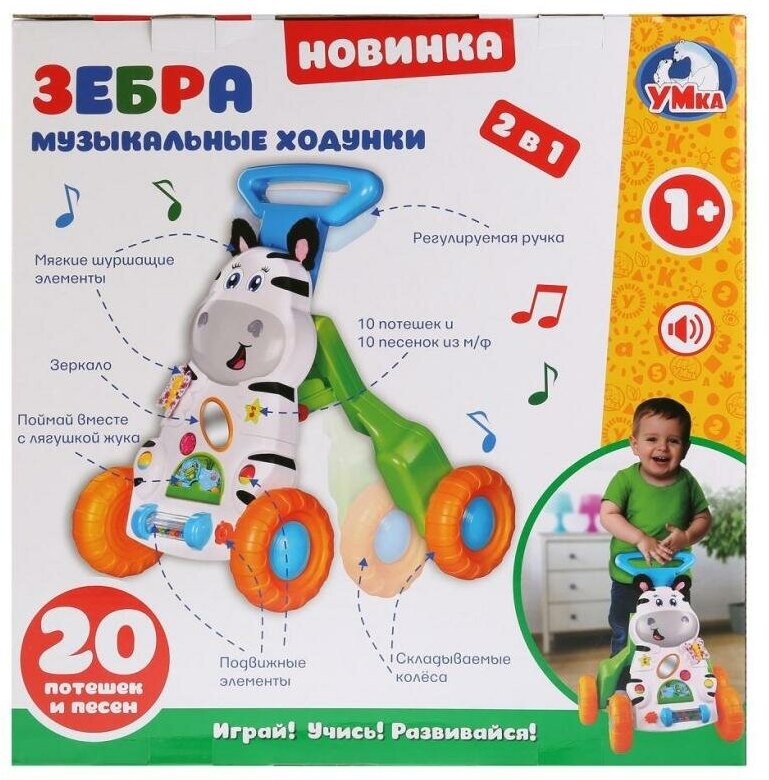 Умка Игрушка музыкальная "Каталка 2 в 1 Зебра" 10 песен и стихов В.Шаинского, 10 потешек интересное: