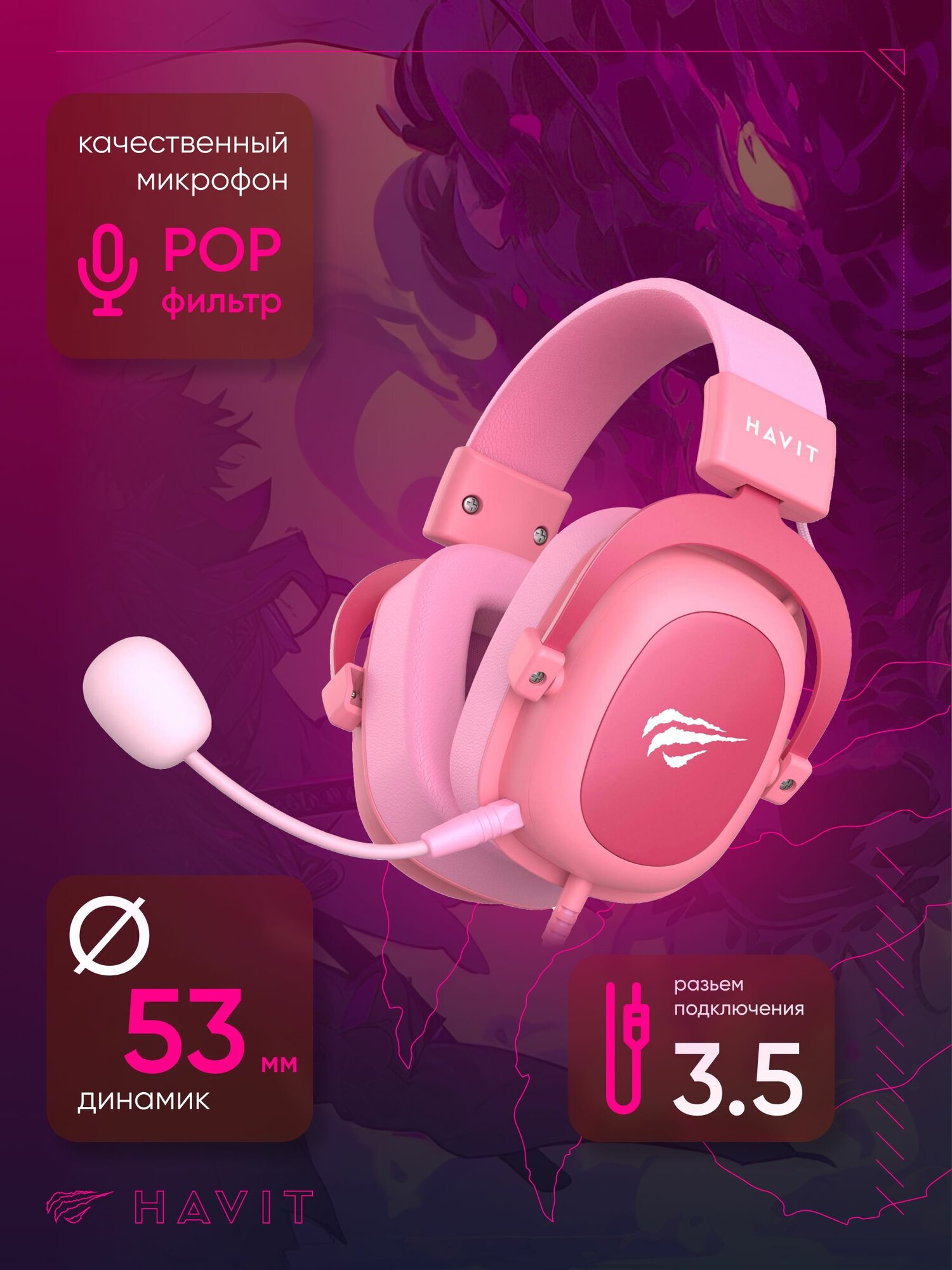 Наушники игровые проводные. Геймерская гарнитура с микрофоном для ПК, компьютера, ноутбука Havit H2002d розовый 3.5 jack