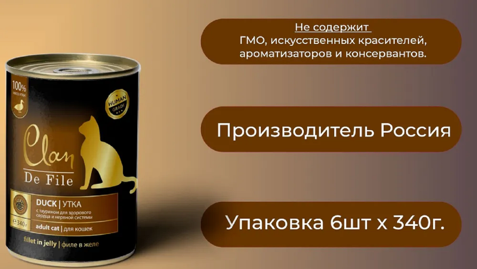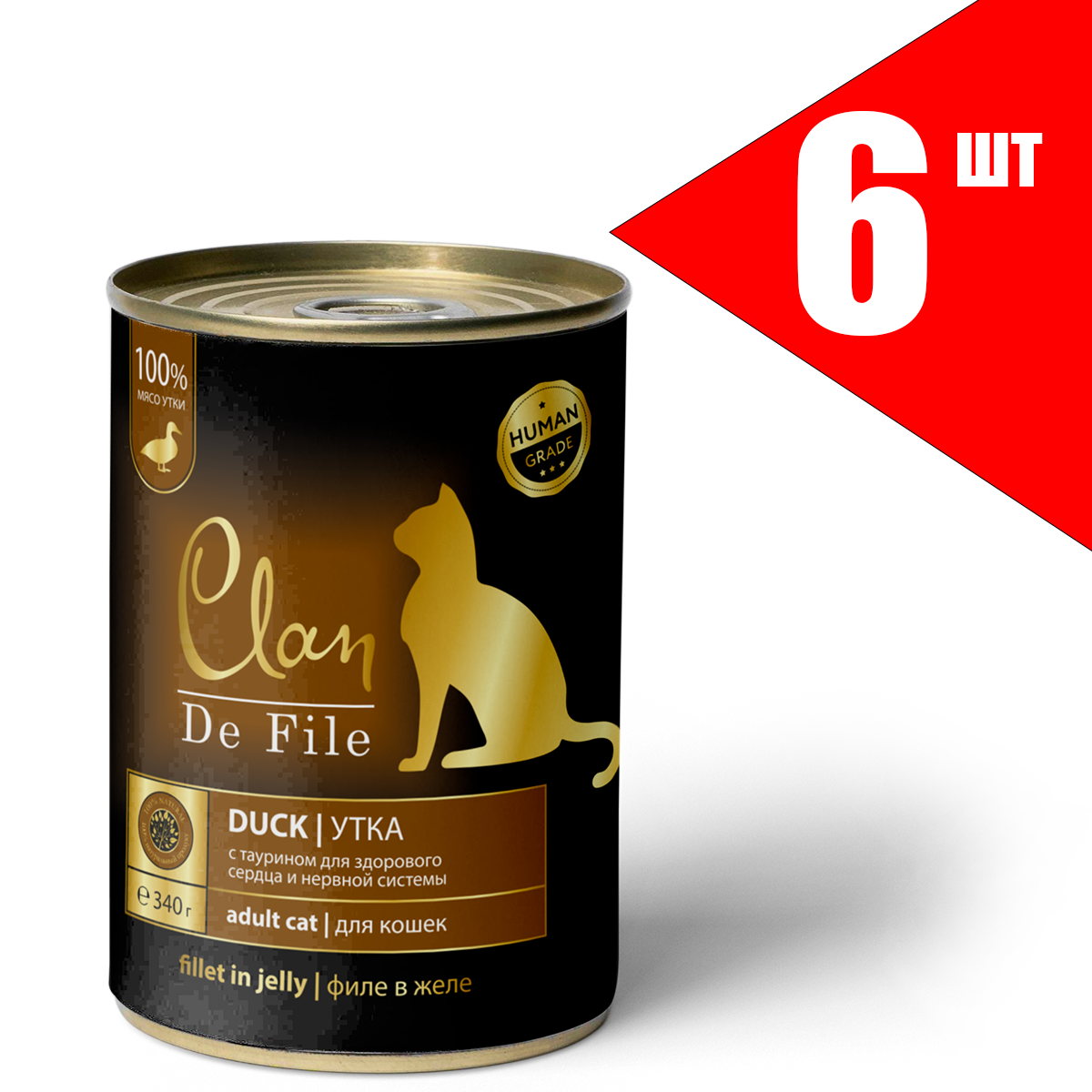 Влажный корм для кошек CLAN De File, беззерновой, с уткой 6 шт. х 340 г
