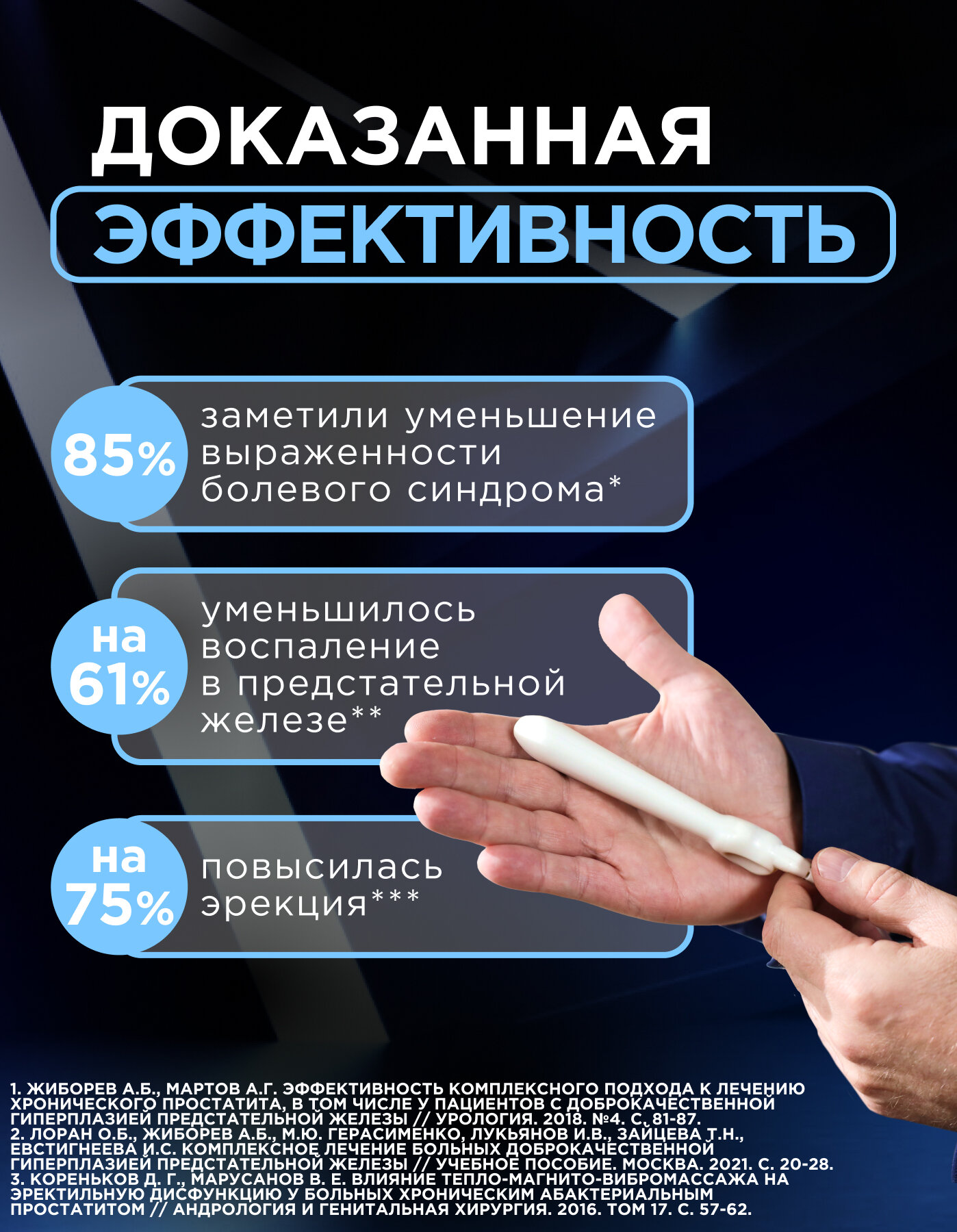 | Отзыв: | Отличная замена пальцевому массажу. Эффект реально есть - боли постепенно снижаются, налаживается мочеиспускание, проходит дискомфорт. Главное все делать по инструкции и не пропускать сеансы. Мне доктор все подробно расписал, действую по его схеме. Разобраться нетрудно |
