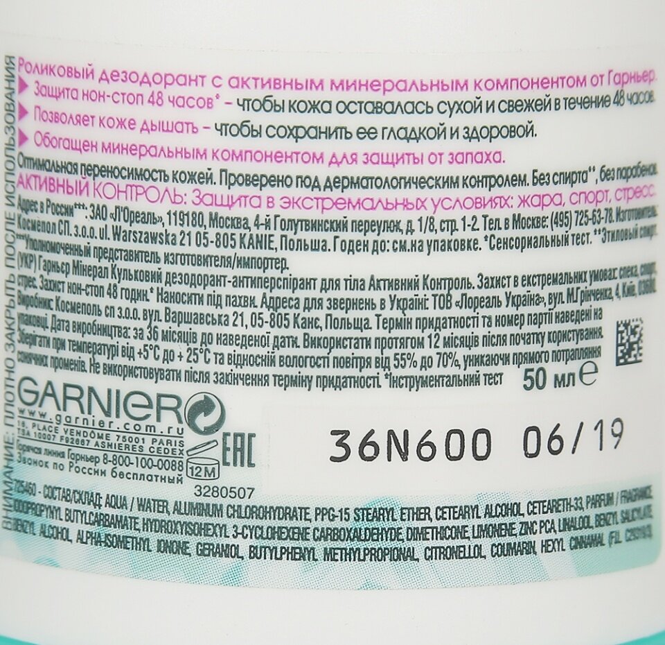 GARNIER Дезодорант-антиперспирант Mineral Активный контроль с активными минералами, защита 48 часов, ролик, 50 мл, 50 г, 1 шт.