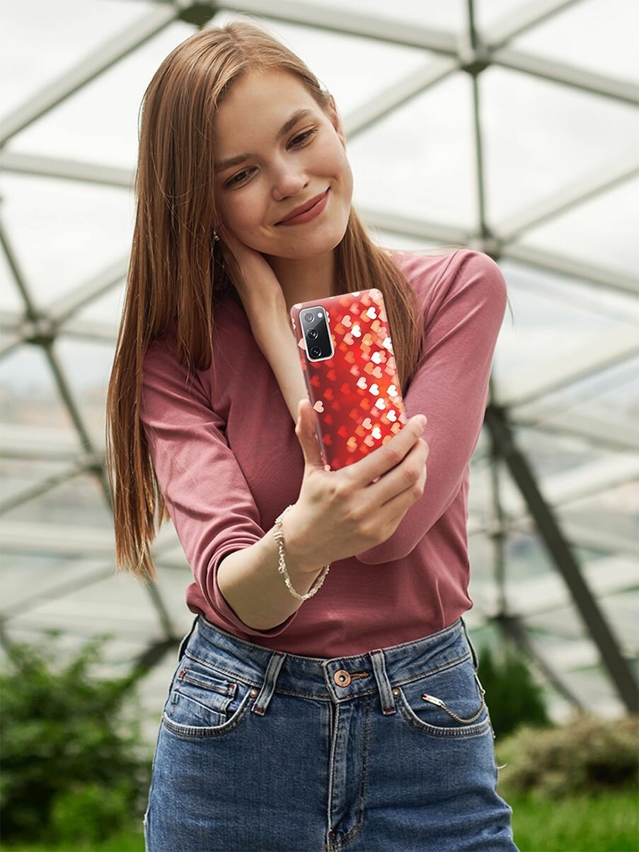 Ультратонкий силиконовый чехол-накладка для Samsung Galaxy S20 FE с принтом "Бокэ из красных сердечек" интересное: