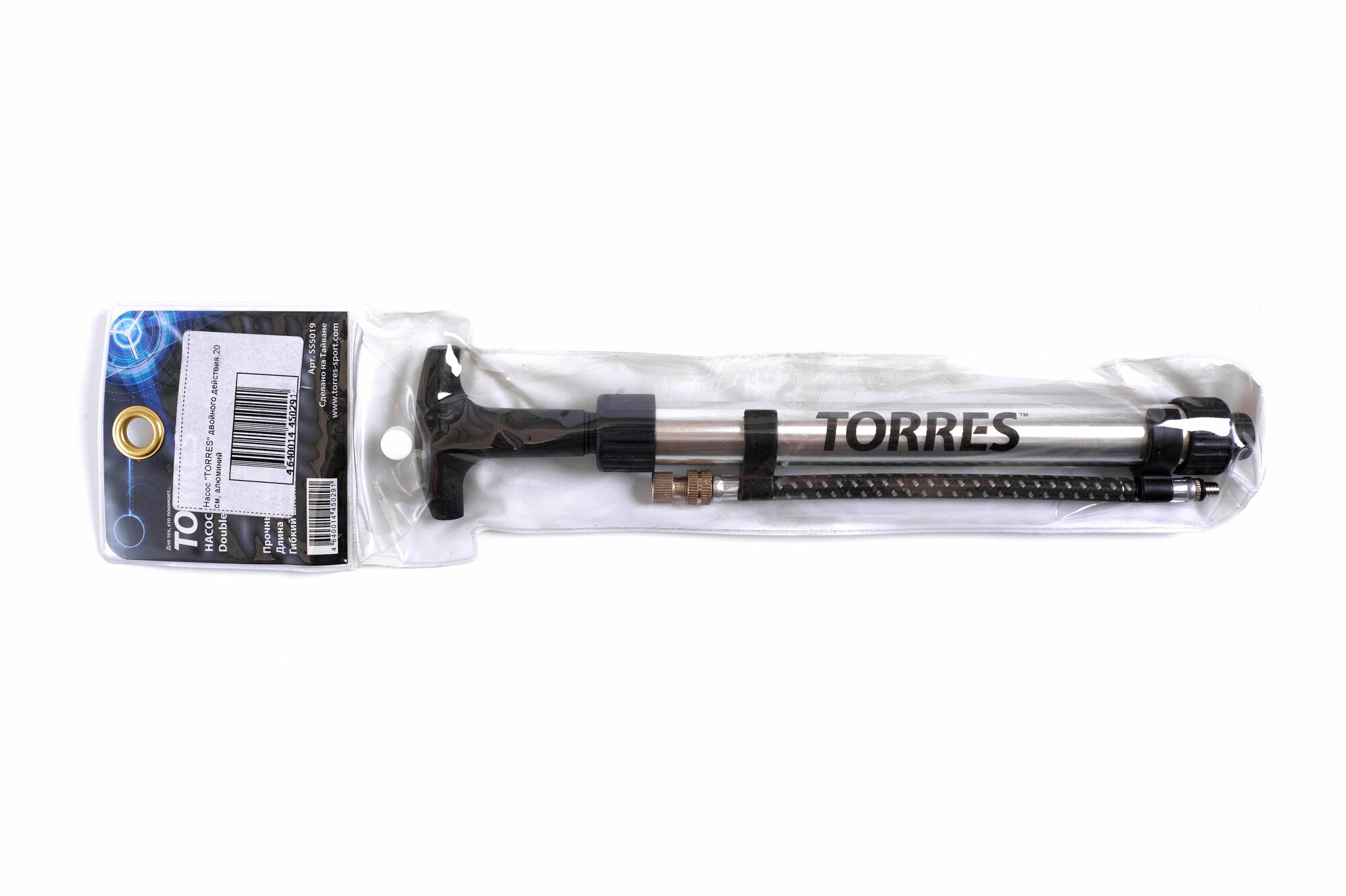 Насос TORRES двойного действия, SS5019, 20 см., алюминий, гибкий шланг, игла (5 мм), серебр.