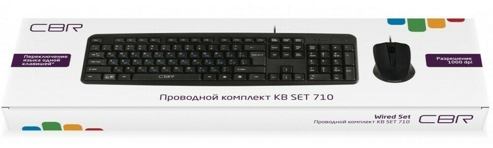 Cbr Клавиатура KB SET 710, Комплект клавиатура + мышь проводной, USB, длина кабеля 1,8 м; клавиатура: полноразмерная, 104 клавиши; мышь: оптическая, 1000 dpi, 3 кнопки и колесо прокрутки
