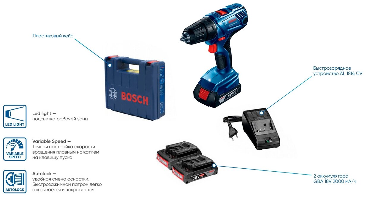 | Подробная комплектация | Дрель, Аккумуляторная батарея 2Ah/18V - 2шт., Зарядная база, Кейс, Инструкция |