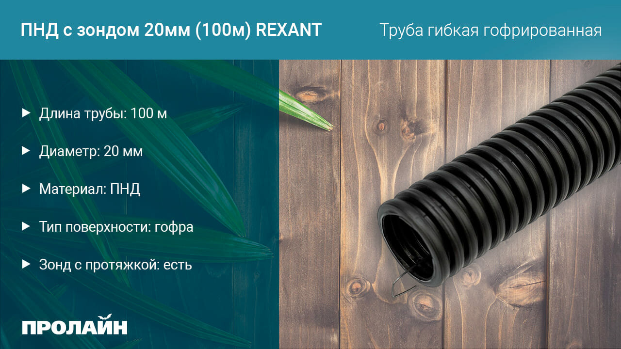 Труба гофрированная Rexant из ПНД с зондом, черная 20 мм, (бухта 100 м/уп.)