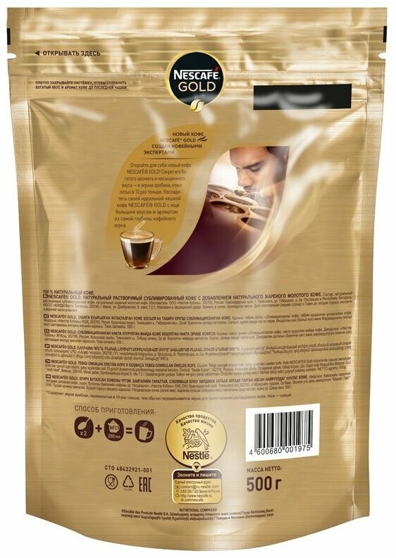 Кофе растворимый Nescafe "Gold", сублимированный, тонкий помол, мягкая упаковка, 500г
