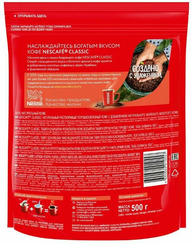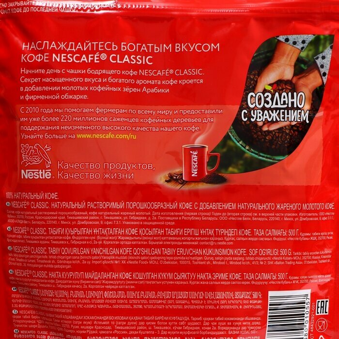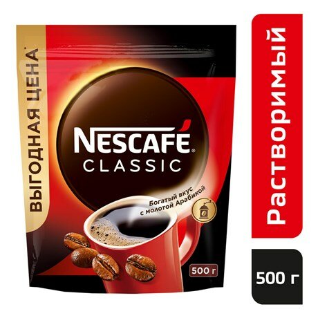 Нескафе Классик растворимый Кофе , NESCAFE Classic мягкая упаковка 500г