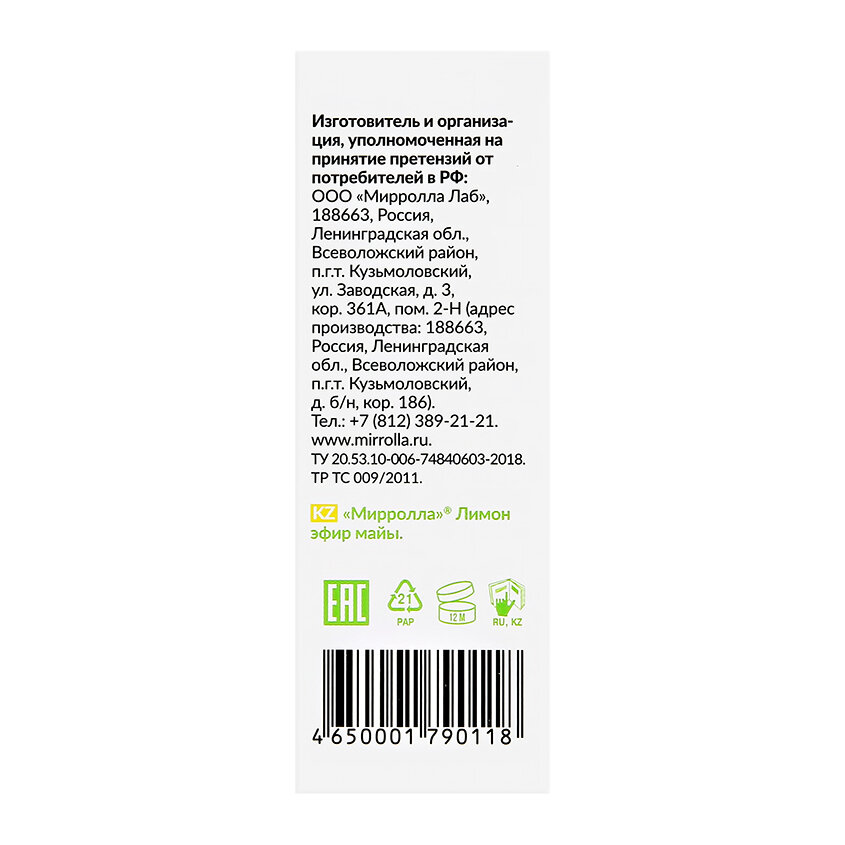бады_mirrolla_Эфирное масло 10мл_лимон 79F001006 .
