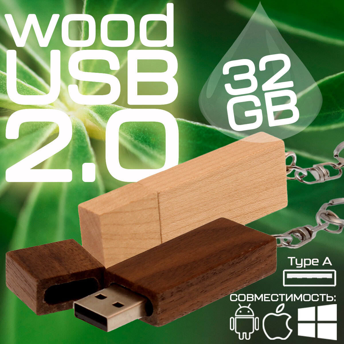 Прямоугольная деревянная флешка Woody с магнитным колпачком (32 Гб / GB USB 3.0 Белый/White Wood2 Flash drive с Карабином WD146)