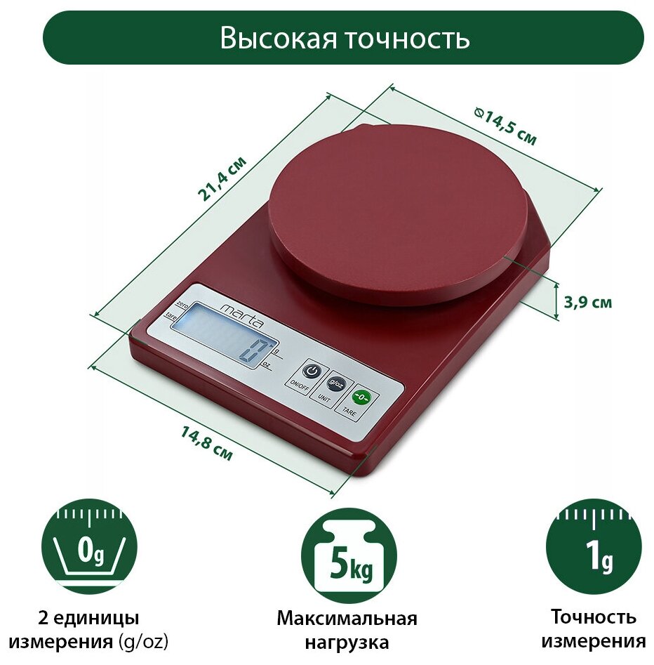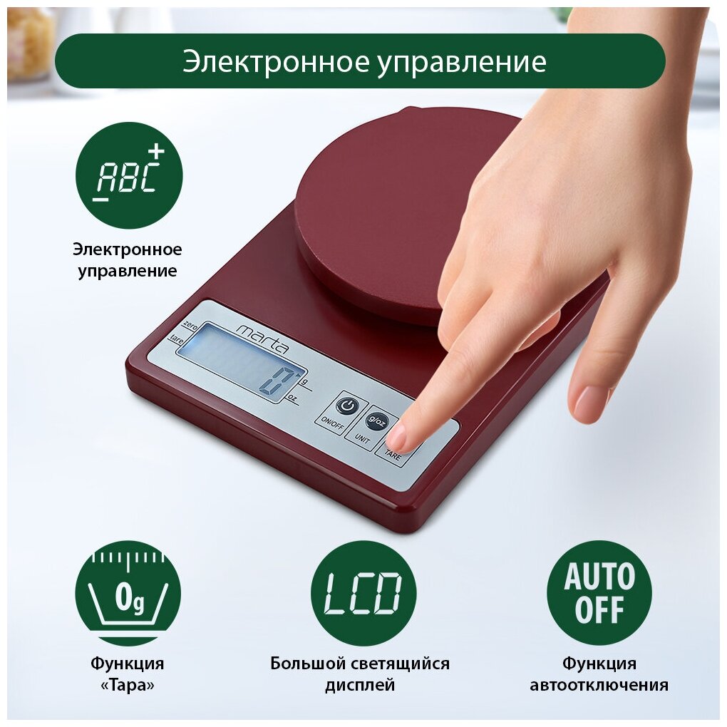 Весы кухонные Marta MT-1637 бордовый гранат электронные Макс.вес 5 кг. деления: 1 г. LCD Диспле