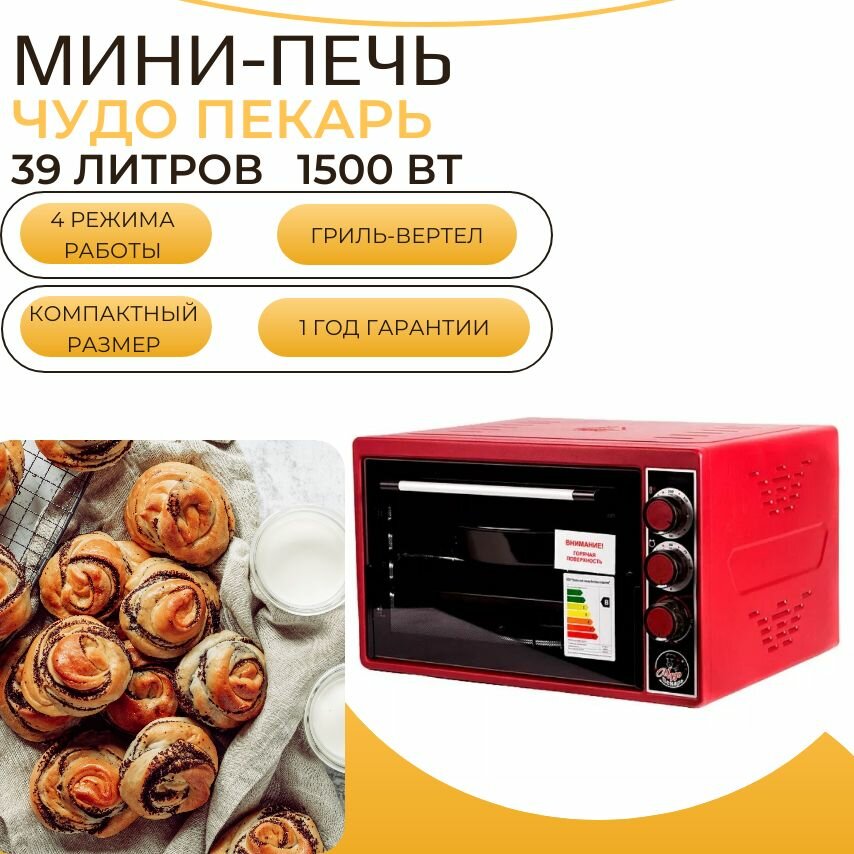 Мини-печь "чудо пекарь" ЭДБ-0124/духовка электрическая настольная (цвет красный, 39 л, 1 противень, толстый нержавеющий ТЭН повышенной мощности, таймер, гриль, терморегулятор)