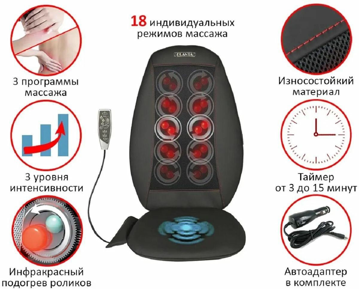 | Плюсы: | Массажные ролики с подогревом, вибрация, можно использовать дома от сети или в машине от прикуривателя |