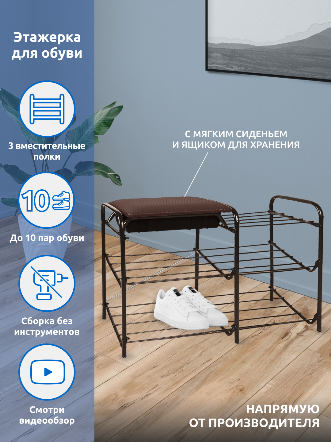 | Плюсы: | Надёжная конструкция, лёгкая сборка, вместительные и удобные отсеки для обуви и ящик для обувных мелочей. |
