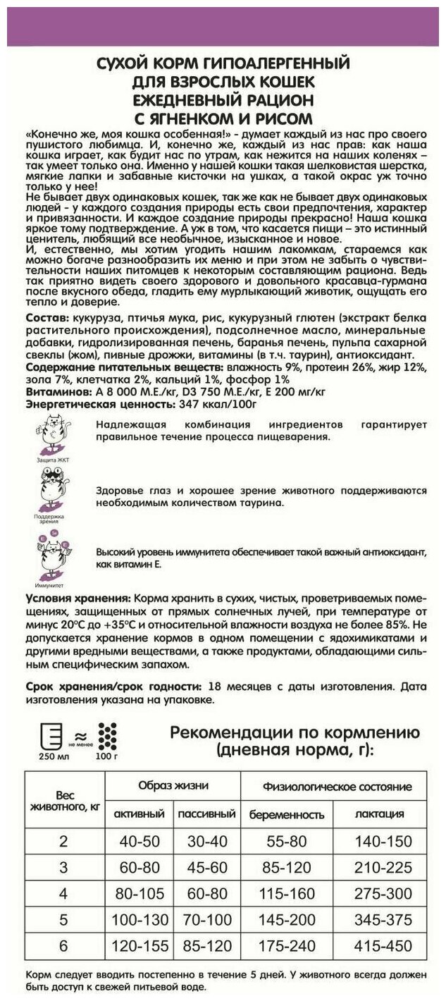 | Состав | кукуруза, птичья мука, рис, кукурузный глютен (экстракт белка растительного происхождения), подсолнечное масло, минеральные добавки, гидролизированная печень, баранья печень, пульпа сахарной свеклы (жом), пивные дрожжи, витамины (в т.ч. таурин), антиоксидант. |