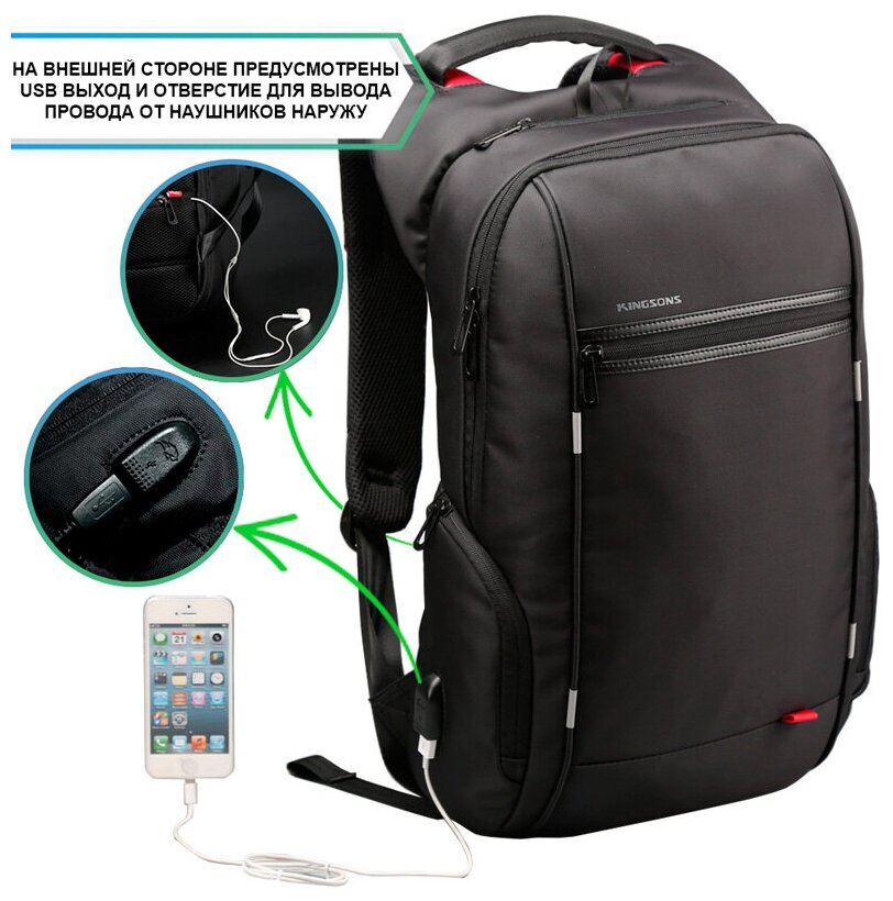 Рюкзак мужской городской дорожный большой 35л для ноутбука 15.6 Kingsons KS3140W 15" Черный водонепроницаемый с USB для взрослых и подростков