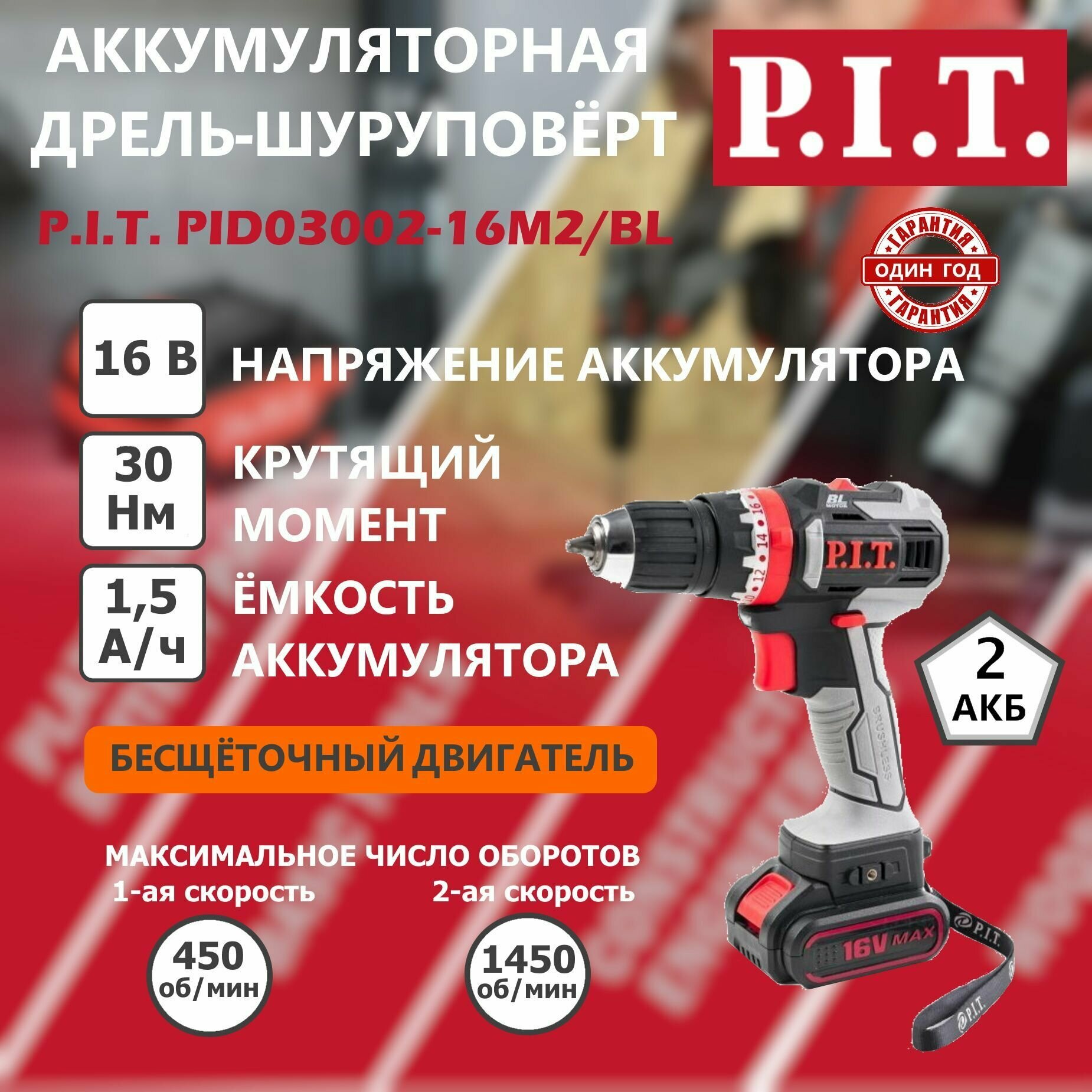 Шуруповерт бесщеточный PID03002-16M2/BL P.I.T