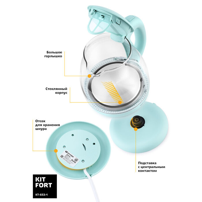 Чайник электрический Kitfort KT-653-1, стекло, 1 л, 1100 Вт, голубой Kitfort 4634819 .