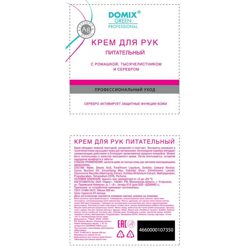 СохранитьDomix Green Professional Крем для рук Питательный с ромашкой, тысячелистником и серебром, 500 мл интересное: