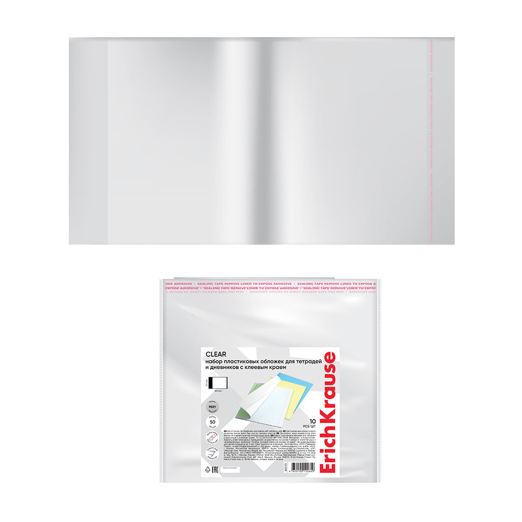 Набор пластиковых обложек ErichKrause Fizzy Clear для тетрадей и дневников, с клеевым краем, 212х395мм, 50 мкм (всего 10 шт., пакет 10 шт.) (44513)