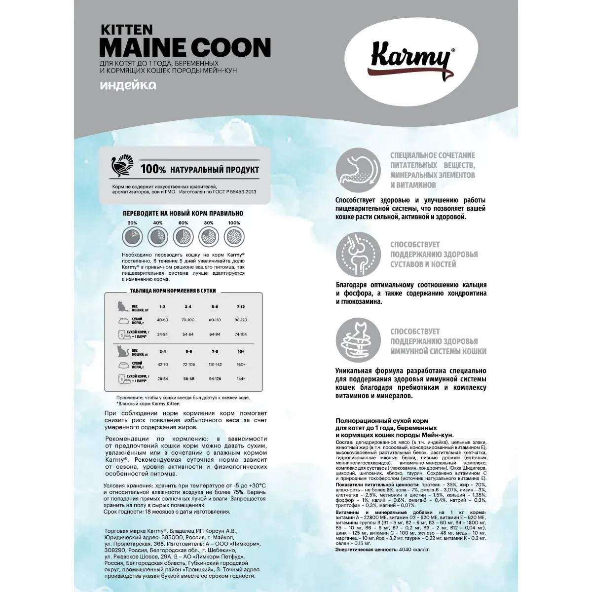 Корм Karmy Main Coon Kitten для котят породы мейн-кун, беременных и кормящих кошек, с индейкой, 1.5 кг