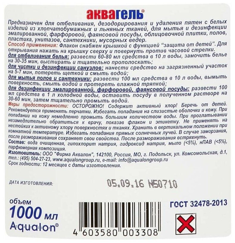 Отбеливатель жидкий Аквалон "Белизна-аквагель", концентрат, 1л (4603580003308) интересное: