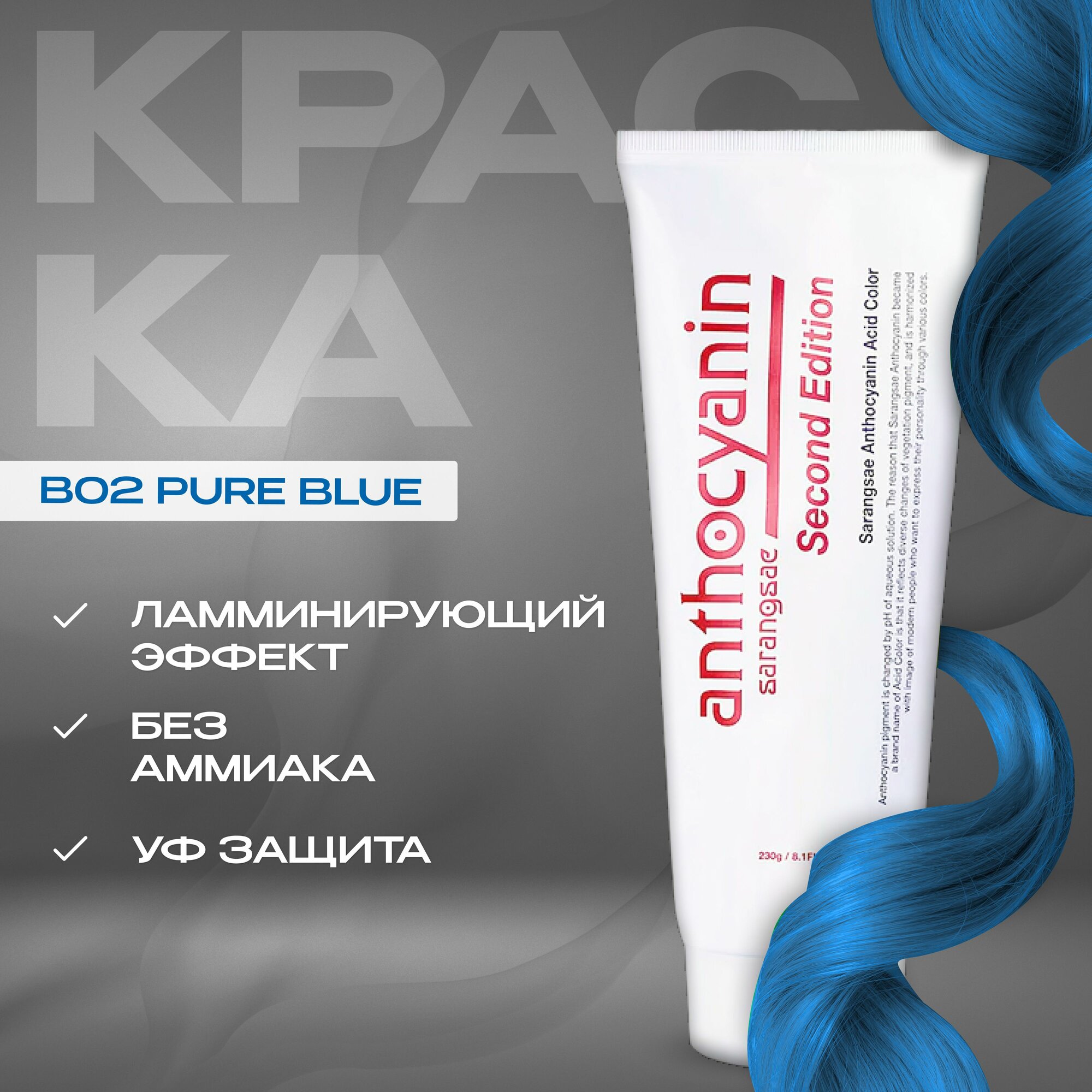 Anthocyanin Голубая краска для волос B02 - Pure Blue 230 мл профессиональная без аммиака ламинирующая
