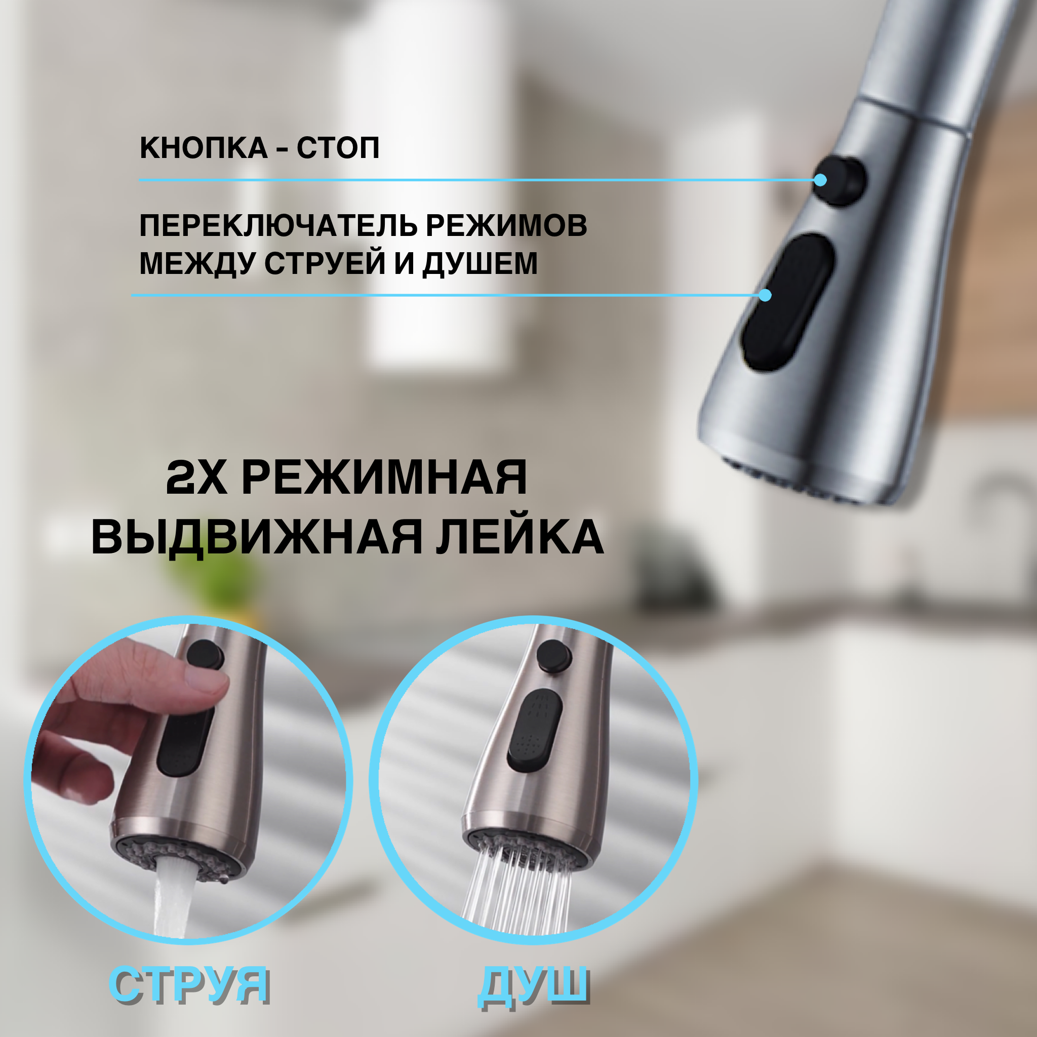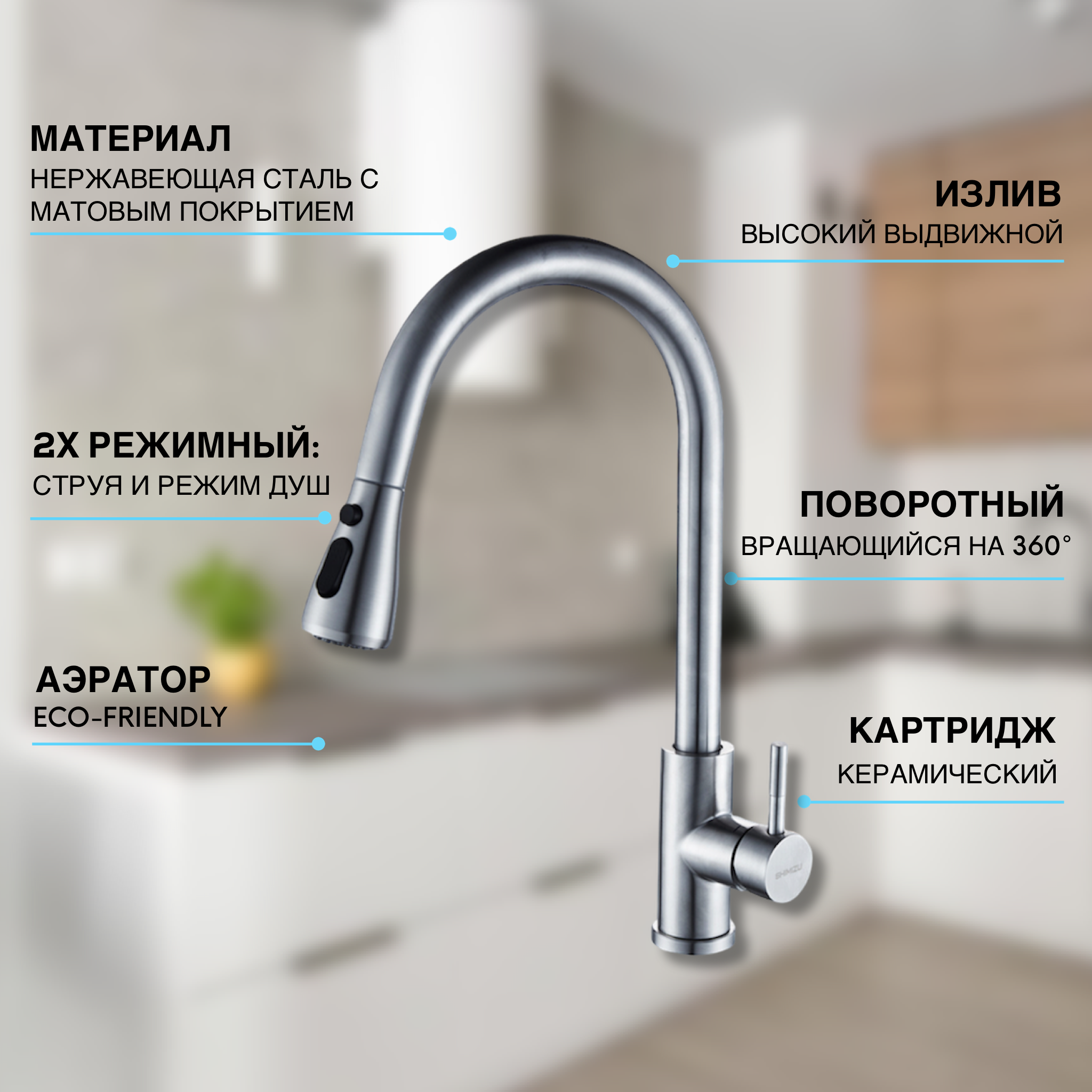 Смеситель для кухни с выдвижным изливом и режимом душ Shimizu High-pull smz 1006565 интересное: