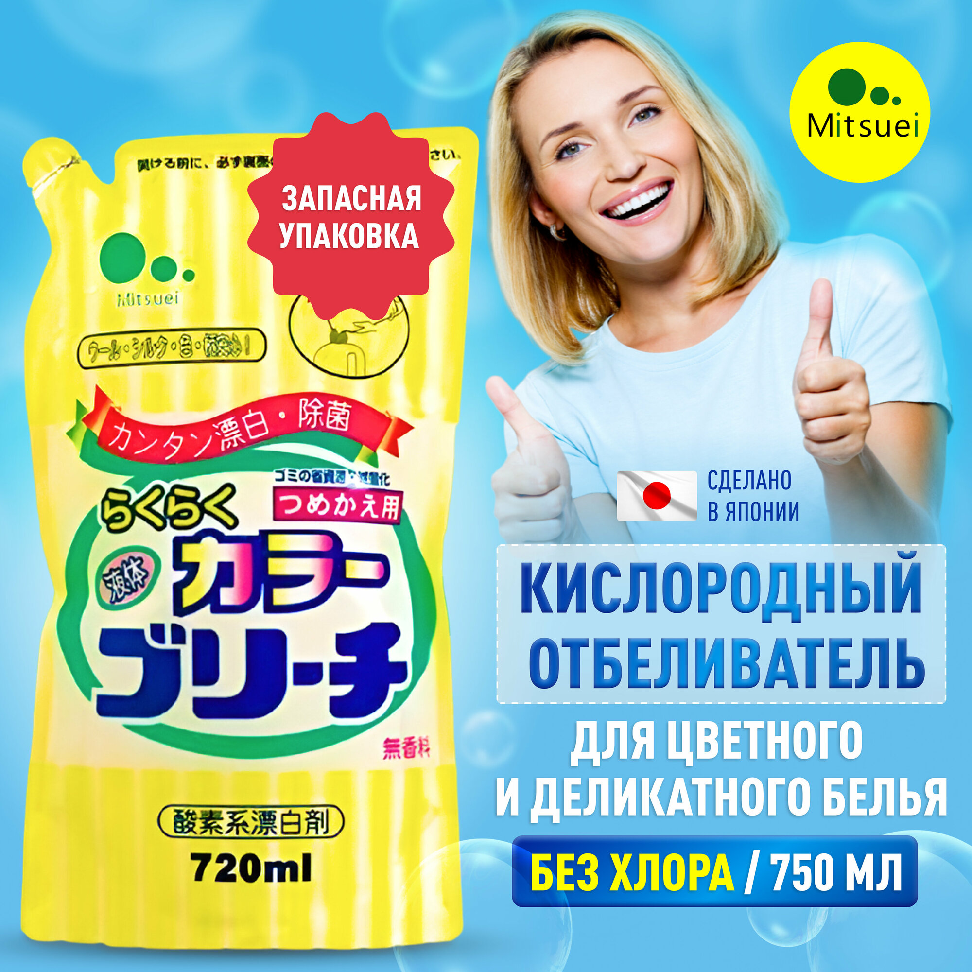 Mitsuei Кислородный отбеливатель для цветных и деликатных вещей, 720 мл, в мягкой упаковке / Жидкий пятновыводитель для стирки белья, без хлора / Японская бытовая химия для дома