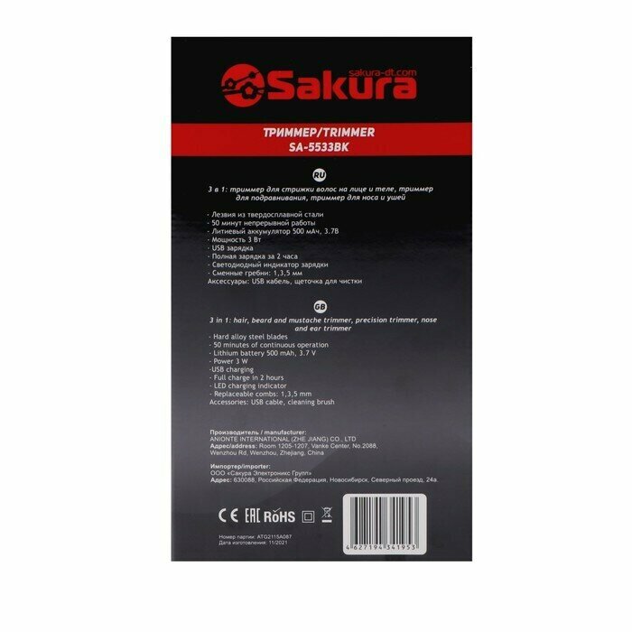 Триммер SA-5533BK, для бороды/усов/носа/ушей, 1-5 мм, 4 насадки, АКБ, чёрный интересное: