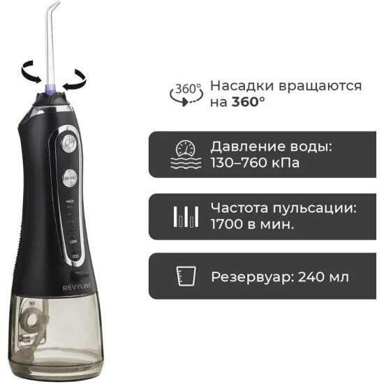 Ирригатор для полости рта REVYLINE RL 450, портативный, емкость резервуара 0,24 л, 5 насадок, черный