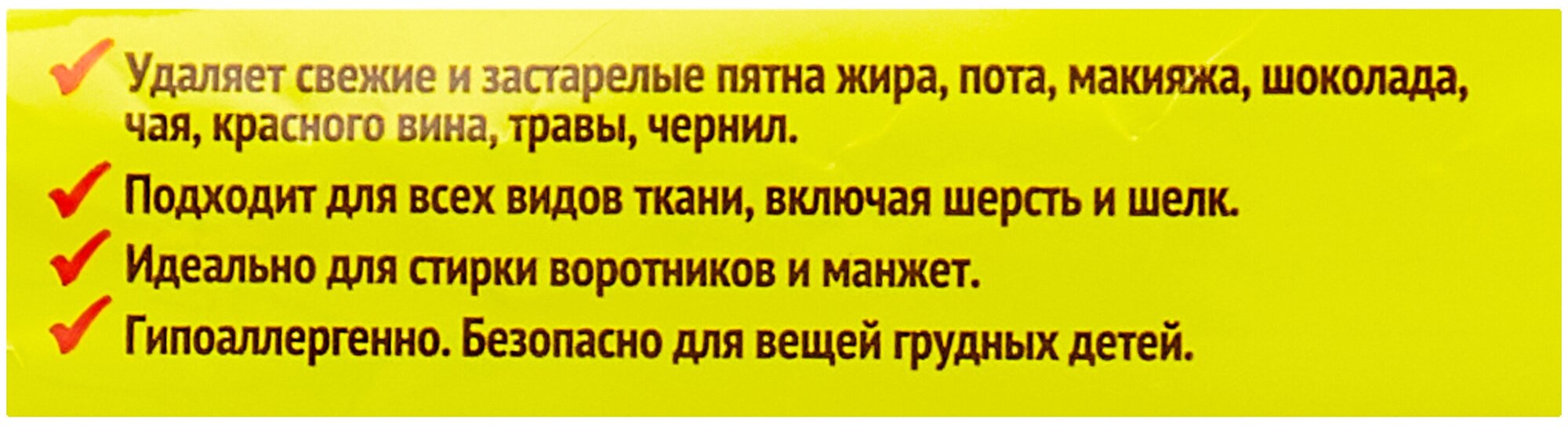 | Плюсы: | Отстирывает застарелые пятна, пятна от сока, крови, жира, фруктов. |