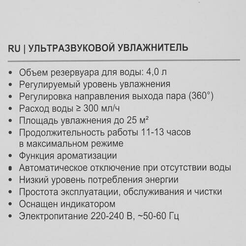 Увлажнитель ультразвуковой BRAYER, 4 л, 25 м, 13 ч., регулировка интенсивности, аромат. BR4700WH