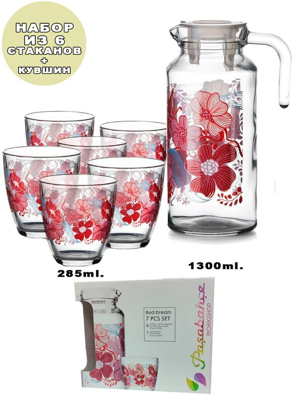 Набор посуды Pasabahce "Red Dream", 7 предметов, кувшин 1300 мл, 6 стаканов 285 мл, стекло