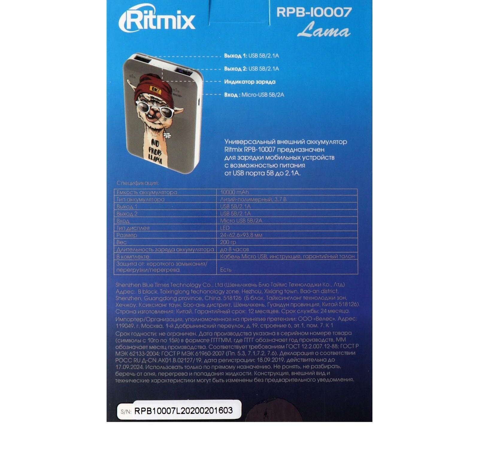 ЗУ RITMIX RPB-10007 Lama, Li-pol, 10000mAh, 2.1А, 2×USB, 1x MicroUSB, Защита от: короткого замыкания/перегрузки/перегрева (1/40)