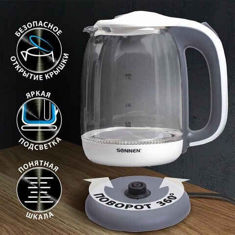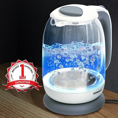 Sonnen Чайник SONNEN KT-1792, 1,7 л, 2200 Вт, закрытый нагревательный элемент, стекло, белый, подсветка