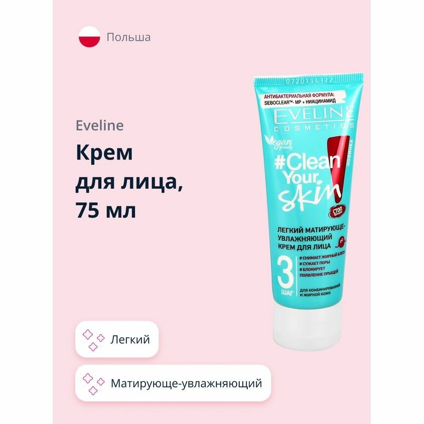 Крем для лица EVELINE CLEAN YOUR SKIN легкий матирующе-увлажняющий, 75 мл