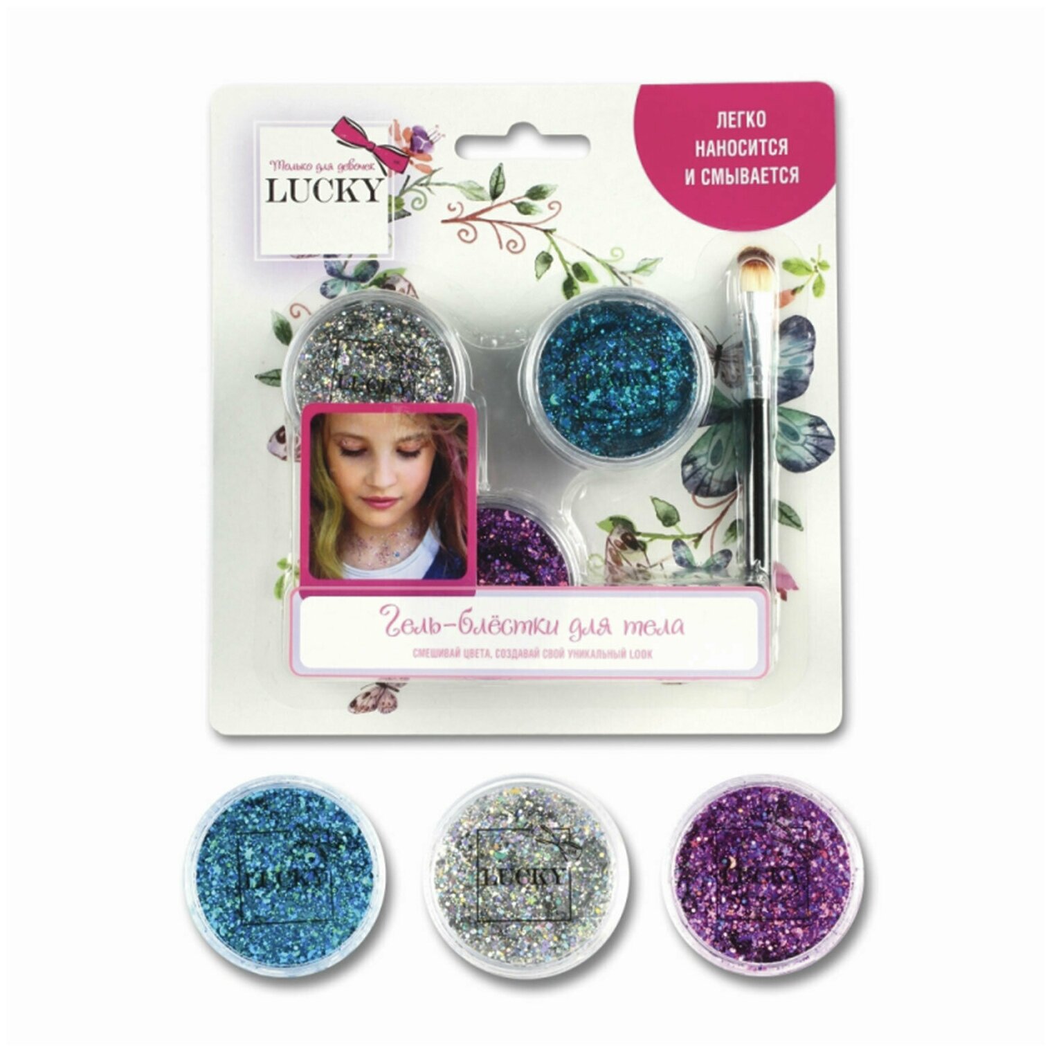 Lucky набор гель-блестки для тела/лица *3 шт+кисточка, цвет: фиолетовый, серебряный, голубой